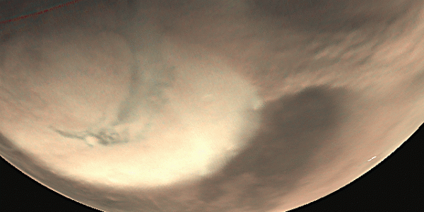 Две камеры на борту космического корабля, стереокамера высокого разрешения (HRSC) и камера визуального мониторинга (VMC), отслеживали штормы в течение последних недель. На снимке вверху этой страницы, сделанном HRSC 26 мая, запечатлен спиральный пылевой шторм, его коричневый цвет контрастирует с белым льдом северной полярной ледяной шапки внизу.