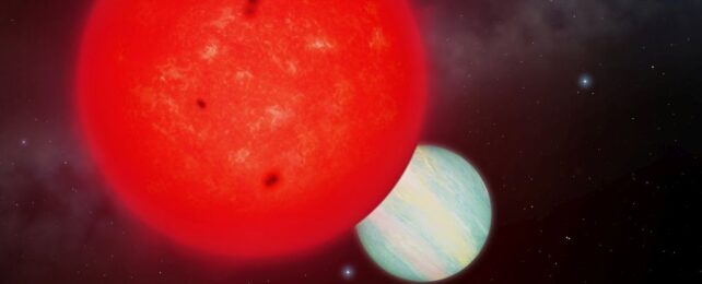 An artist’s impression of gas giant exoplanet TOI-6984b orbiting its tiny red dwarf host star.