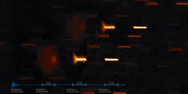 Первое изображение (слева) начало экспонироваться спустя 41 секунду после начала землетрясения, а регистрация последнего (справа) закончилась примерно через 100 секунд после него. Изображение каждой звезды повторяется трижды. Во время экспозиции вибрации почвы от землетрясения размывают звездные треки. С течением времени влияние землетрясения на изображения постепенно уменьшается (ближе к правому краю кадра).